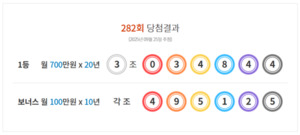 [뉴스클레임] 제282회 연금복권 720+ 1등 당첨번호가 공개됐다.동행복권에 따르면 282회 연금복권 720+ 1등 당첨번호는 ‘3조 034844’이다. 이번 회차 1등 당첨자는 나오지 않았다. 1등에 당첨될 경우 매달 700만원씩 20년간 연금식으로 받게 되며, 세후 월 실수령액은 약 546만원이다.2등 당첨번호는 ‘034844’이고, 2등 당첨자도 이번에는 배출되지 않았다. 2등에 당첨되면 월 100만원을 10년간 연금식으로 받는다.3등 당첨번호는 ‘34844’이며, 57명에게 각 100만원이 지급된다.4등 당첨번호는 ‘484