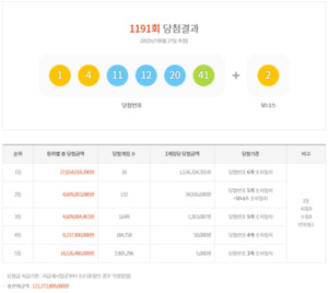 [뉴스클레임] 로또 제1191회 당첨번호가 발표됐다.동행복권에 따르면 이번 회차 1등 당첨번호는 ‘1, 4, 11, 12, 20, 41’이다.2등 보너스 번호는 ‘2’이다.1등 당첨자는 총 18명으로, 각 15억3633만4355원의 당첨금을 받는다.2등 당첨자는 총 132명이다. 이들은 각 3491만6690원의 당첨금을 받게 된다.3등 당첨자 3649명은 126만3087원의 당첨금을 받는다.고정당첨금 5만원을 받는 4등 당첨자는 총 18만4758명이다.고정당첨금 5000원을 받는 5등 당첨자는 290만5296명이다.1등 당첨자 18
