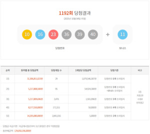 [뉴스클레임]로또 제1192회 당첨번호가 발표됐다.동행복권에 따르면 이번 회차 1등 당첨번호는 ‘10, 16, 23, 36, 39, 40’이다.2등 보너스 번호는 ‘11’이다.1등 당첨자는 총 29명으로, 각 10억7954만6587원의 당첨금을 받는다.2등 당첨자는 총 95명이다. 이들은 각 5492만4300원의 당첨금을 받게 된다.3등 당첨자 3476명은 150만1096원씩의 당첨금을 받는다.고정당첨금 5만원을 받는 4등 당첨자는 총 17만1551명이다.고정당첨금 5000원을 받는 5등 당첨자는 284만1016명이다.1등