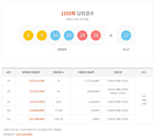 [뉴스클레임]로또 제1193회 당첨번호가 발표됐다.동행복권에 따르면 이번 회차 1등 당첨번호는 ‘6, 9, 16, 19, 24, 28’이다.2등 보너스 번호는 ‘17’이다.1등 당첨자는 총 16명으로, 각 17억1701만3508원의 당첨금을 받는다.2등 당첨자는 총 84명이다. 이들은 각 5450만8366원의 당첨금을 받게 된다.3등 당첨자 3635명은 125만9616원씩의 당첨금을 받는다.고정당첨금 5만원을 받는 4등 당첨자는 총 17만5936명이다.고정당첨금 5000원을 받는 5등 당첨자는 278만2376명이다.1등 당첨자 16