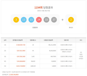 [뉴스클레임]로또 제1194회 당첨번호가 발표됐다.동행복권에 따르면 이번 회차 1등 당첨번호는 ‘3, 13, 15, 24, 33, 37’이다. 2등 보너스 번호는 ‘2’이다.1등 당첨자는 총 28명으로, 각 9억8515만5349원의 당첨금을 받는다.2등 당첨자는 총 99명이다. 이들은 각 4643만8300원의 당첨금을 받게 된다.3등 당첨자 5442명은 84만4799원씩의 당첨금을 받는다.고정당첨금 5만원을 받는 4등 당첨자는 총 18만6820명이다.고정당첨금 5000원을 받는 5등 당첨자는 288만4544명이다.1등 당첨자 28명