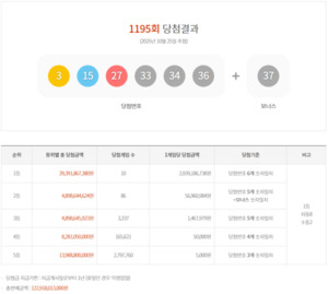[뉴스클레임] 로또 제1195회 당첨번호가 발표됐다.동행복권에 따르면 이번 회차 1등 당첨번호는 ‘3, 15, 27, 33, 34, 36’이다.2등 보너스 번호는 ‘37’이다.1등 당첨자는 총 10명으로, 각 29억3918만6738원의 당첨금을 받는다.2등 당첨자는 총 86명이다. 이들은 각 5696만984원의 당첨금을 받게 된다.3등 당첨자 3337명은 146만7979원씩의 당첨금을 받는다.고정당첨금 5만원을 받는 4등 당첨자는 총 16만5621명이다.고정당첨금 5000원을 받는 5등 당첨자는 279만7760명이다.