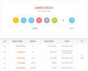 [뉴스클레임]로또 제1196회 당첨번호가 발표됐다.동행복권에 따르면 이번 회차 1등 당첨번호는 ‘8, 12, 15, 29, 40, 45’이다.2등 보너스 번호는 ‘14’이다.1등 당첨자는 총 15명으로, 각 20억162만7550원의 당첨금을 받는다.2등 당첨자는 총 94명이다. 이들은 각 5323만4776원의 당첨금을 받게 된다.3등 당첨자 2837명은 176만3860원씩의 당첨금을 받는다.고정당첨금 5만원을 받는 4등 당첨자는 총 15만3894명이다.고정당첨금 5000원을 받는 5등 당첨자는 261만9093명이다.1등 당