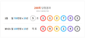[뉴스클레임]제288회 연금복권 720+ 1등 당첨번호가 공개됐다.동행복권에 따르면 288회 연금복권 720+ 1등 당첨번호는 ‘5조 112703’이다. 1등 당첨자는 2명이다.1등에 당첨될 시 매달 700만원씩 20년간 연금식으로 받게 되며, 세후 실수령액은 월 약 546만원이다.2등 당첨번호는 ‘112703’이며, 당첨자는 8명이다. 2등에 당첨될 경우 월 100만원을 10년간 연금식으로 받는다.3등 당첨번호는 ‘12703’이며, 총 86명이 각 100만원을 지급받게 된다.4등 당첨번호는 ‘2703’이다. 당첨자 총 565명은