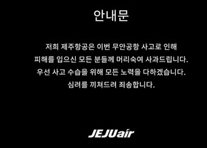 [뉴스클레임]제주항공은 "이번 무안공항 사고로 인해 피해를 입으신 모든 분들께 머리숙여 사과드린다"며"우선 사고 수습을 위해 모든 노력을 다하겠다"는 안내문을 냈다.이어 "심려를 끼쳐드려 죄송하다. 제주항공은 현재 전사적 비상대응 체제로 운영 중에 있다"고 전했다.또 "유가족 지원인력 구성했으며, 사상자와 가족에 대하여필요한 사항을 빠짐없이 지원하도록 하겠다"고 덧붙였다.탑승자 가족 문의(국내) 080-898-1500(해외) +82-1599-8629[뉴스클레임]