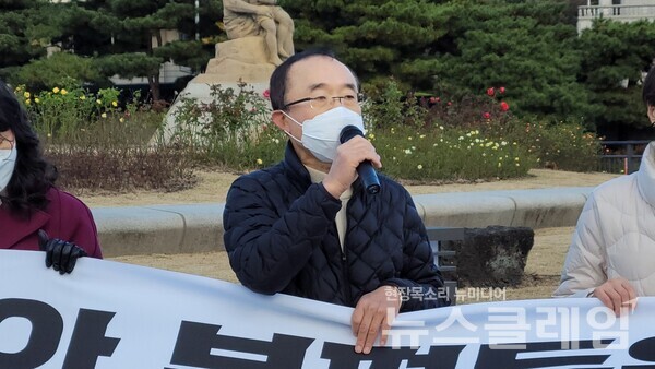 송기균 집값정상화시민행동 대표는 “나라는 있지만 내 집이 없다. 그야말로 지옥 같은 삶을 살고 있다”며 “이 사태를 만든 원흉들, 을사오적 못지않은 엄청난 죄인들을 역사 기록에 남기기 위해 오늘 이 자리에 섰다”고 말문을 열었다.