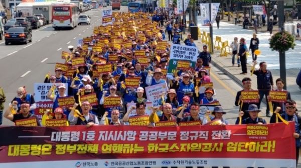 한편 수기주노조는 결의대회를 통해 수자원공사에 ▲점검정비노동자의 1단계 전환 대상 인정 ▲노사전협의체 즉각 구성 ▲점검정비노동자 전원 정규직 전환 즉각 이행을 요구했다. 광화문광장에서 결의대회를 마친 수기주노조는 청와대로 행진해 다시 한 번 청와대에 정규직 전환 요구를 담은 서한문을 전달하기도 했다.