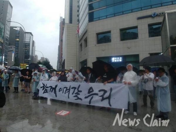 이날 오후 7시 강남역 사거리에서 김 씨를 응원하는 문화제도 열렸다. 이날 문화제에는 노동자, 시민 등이 참여해 김 씨에게 응원의 메시지를 전하고 삼성 측에 해고자 원직 복직을 촉구했다.