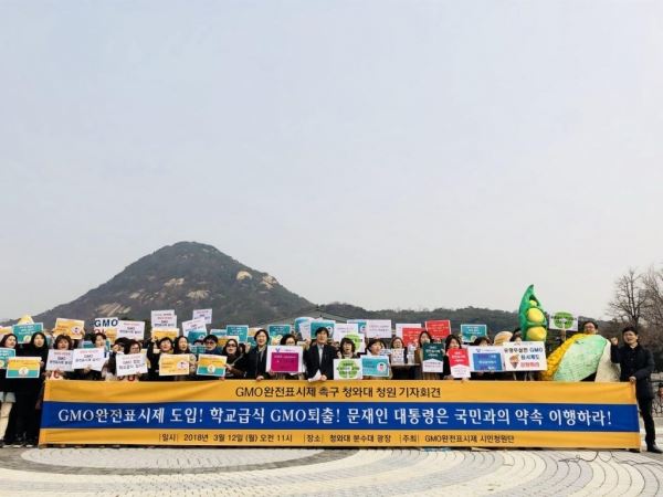 이날 이들은 △GMO를 사용한 식품에 예외 없는 GMO표시 △공공급식, 학교급식에 GMO식품 사용 금지 △Non-GMO 표시를 막는 현행 식약처 고시 개정 등을 촉구하며 청와대 국민청원을 시작했다.