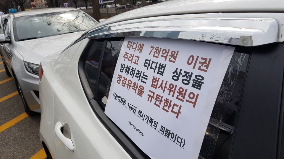 3일 택시기사들의 모임인 타다 비상대책특별위는 서울 여의도 국회 앞과 서초구 중앙지법 앞에서 타다금지법 통과 촉구 기자회견을 열고 금번 타다 무죄에 따른 대법원 판결을 강력히 규탄했다.