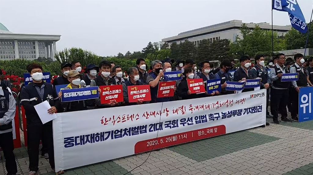 민주노총은 25일 서울 여의도 국회 앞에서 기자회견을 열고 “산재사망은 살인이다. 21대 국회는 중대재해기업처벌법을 지금 당장 입법해야 한다”고 주장하며 농성투쟁에 돌입했다.